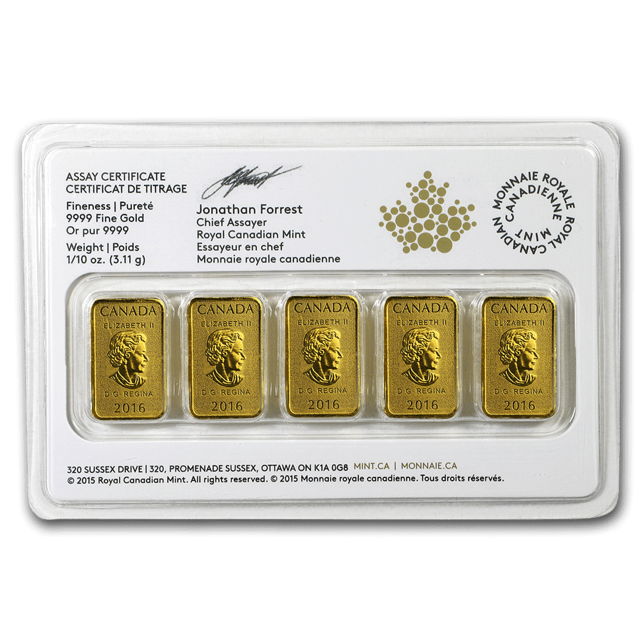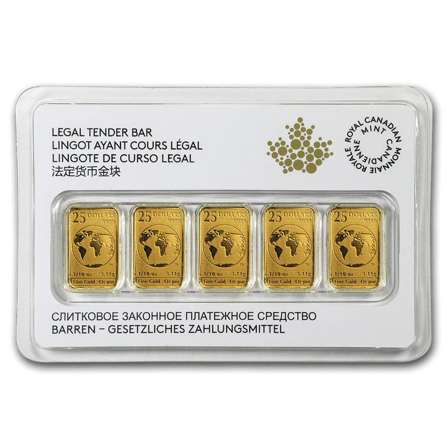 The only non-CUSIP Bars on the market… these Canadian legal tender bars are Guaranteed for their weight and purity by the Royal Canadian Mint, ten individual 1/10 oz., 99.99% pure gold bullion legal tender bars are secured in a credit card size barter case that slides open for simplified distribution.
