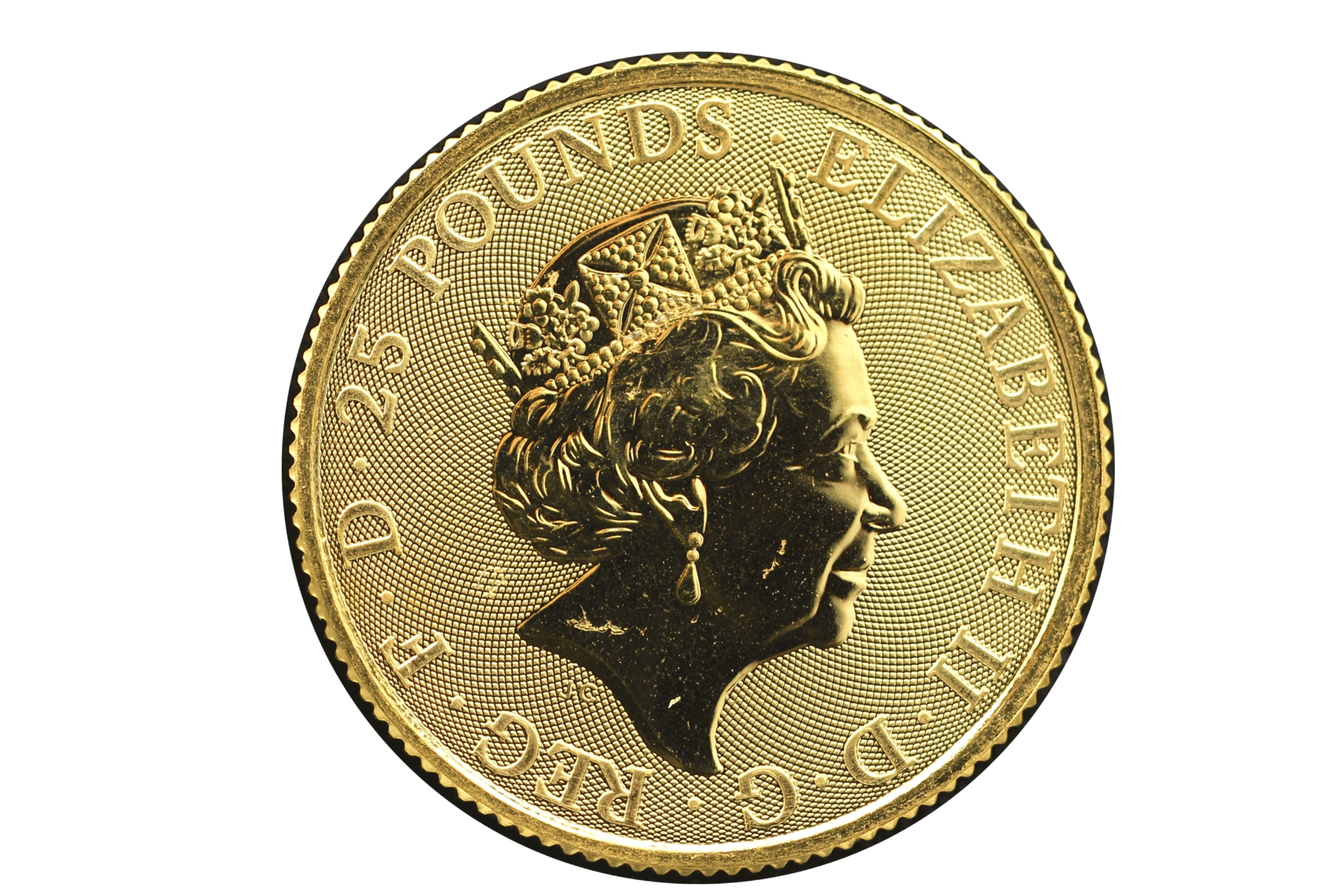 This quarter ounce beauty is struck by the Royal Mint and displays the fifth portrait of Her Majesty Queen Elizabeth II along with the face value of 25 pounds. The reverse features a sow nursing her piglets with a country home in the backdrop.