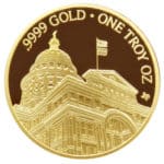 The exquisite Texas Gold Round pays homage to the iconic symbols of Texas and one of the most hallowed landmarks in the Lone Star State — the Texas State Capitol. The towering Capitol building proudly dominates the reverse of the Texas Gold Round, rising up on the face of the round echoing the splendor of the building’s architecture. The Capitol’s south facade is prominently displayed in the foreground of the round, with the American and Texan flags fluttering boldly above the entrance to the building. The Capitol dome juts augustly into the background above the facade with the original sixteen-foot tall Goddess of Liberty statue, installed in 1888, visible at the peak of the structure. The Texas Gold Round’s specifications – “.9999 Gold • One Troy Oz” – are engraved in an arch over the Capitol. The weight and purity of the round are guaranteed.